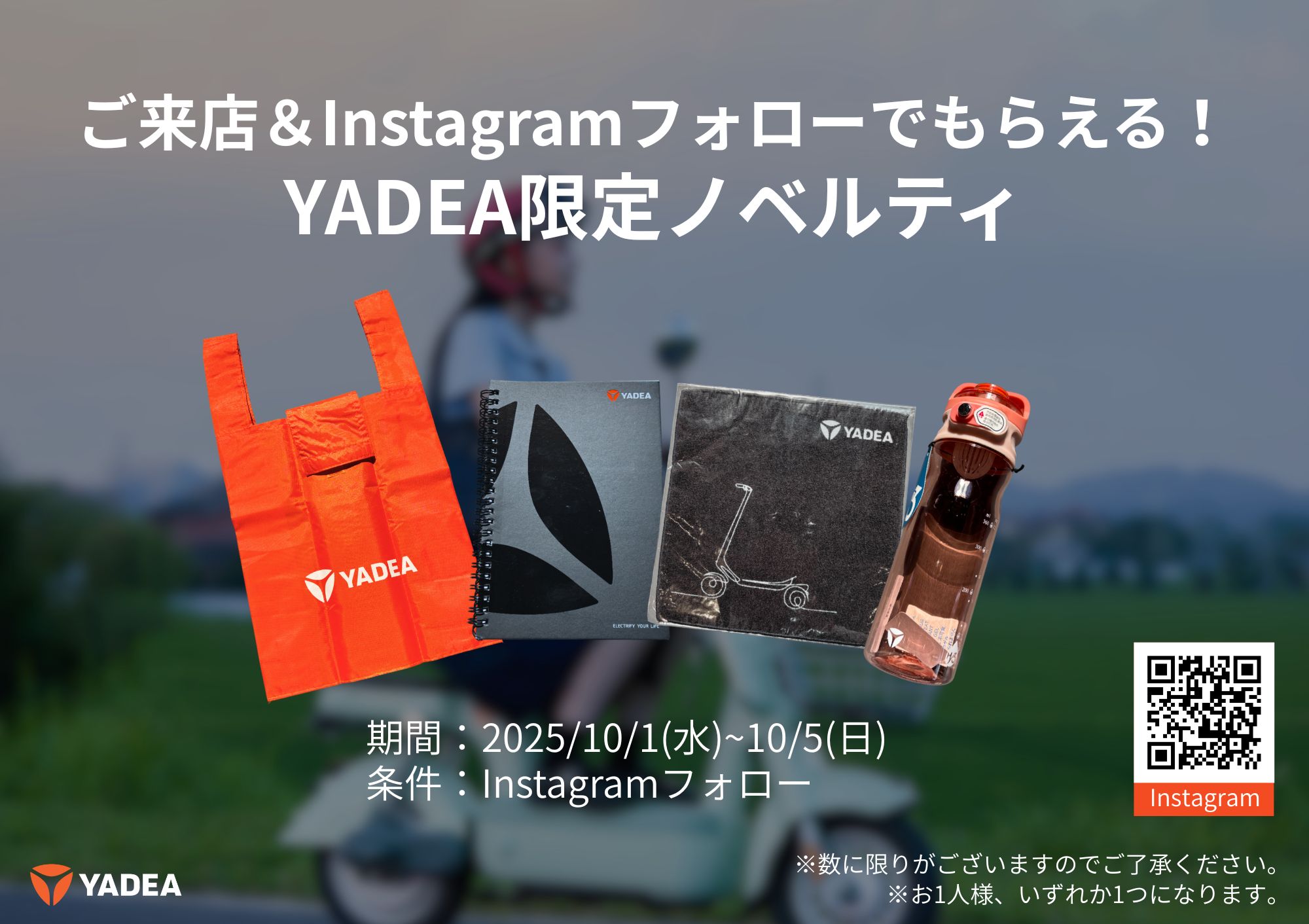 TOP> ニュース> 関西初の直営店“YADEA西宮北口”本日グランドオープン” 関西初の直営店“YADEA西宮北口”本日グランドオープン” お知らせプレスリリース 2025.10.01 世界一の電動二輪モビリティブランドYADEAの直営店が西宮北口にオープン。2024年5月にオープンした東京・表参道に続き2店舗目。 世界を席巻するYADEAの電動バイク・電動アシスト自転車・電動キックボード オープン特典として、10月5日(日)までに機体をご購入いただいた方限定でオリジナルポーチをプレゼント また、ご来店&YADEA.JPのInstagramフォローで限定ノベルティも! 店舗の営業時間は、10時~20時 年中無休なので、是非ご来店お待ちしております。 PREV NEXT SHAREこの記事をシェアする方はこちらから RELATED ARTICLES — 関連記事 — ポップなデザインが特徴の「CC-01T」特定小型が発売 お知らせプレスリリース 2025.04.07 関西初の直営店舗「YADEA西宮北口」誕生 お知らせプレスリリース 2025.07.22 夏季休業日のお知らせ お知らせ 2025.08.08 CATEGORY ALL お知らせメディアプレスリリースコラムイベント